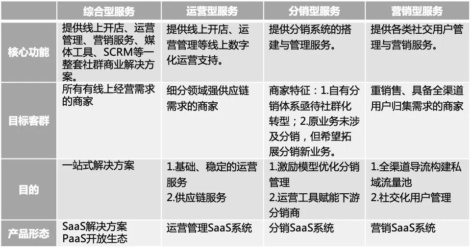 社群基于去中心化的网络在各个连接场景内进行构建、传播、维护,其中当下最大的网络连接场景是微信。在各个连接场景体系内,诞生了一系列服务于社群的超级网络服务商,按照他们提供的产品服务功能以及对应的业务环节可以分为以下四类。