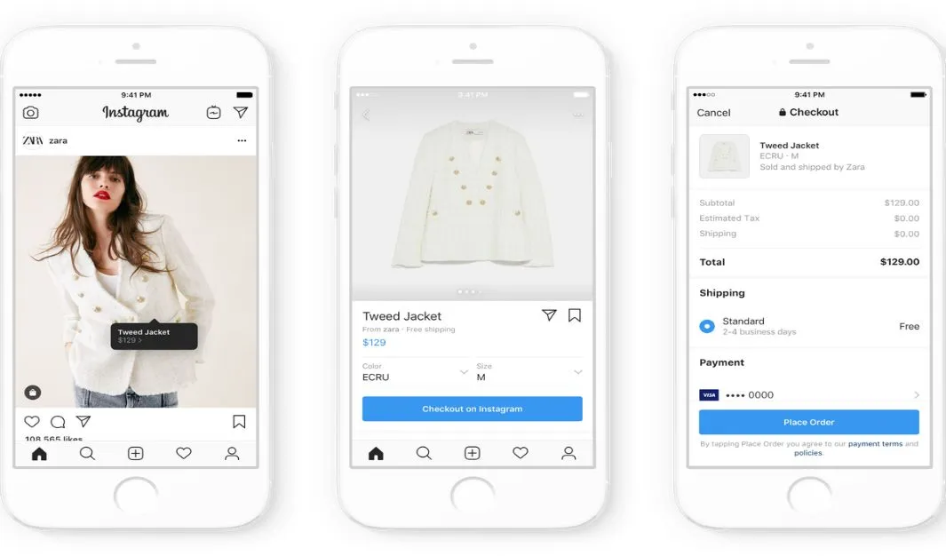 2019年3月,Instagram首次推出了Instagram Shopping功能,该功能首先对Adidas, Prada等30个品牌开放,让用户能够直接在Instagram上通过点击标签直接购买商品。截至2019年6月,该功能拓展到了60个品牌。Instagram Shopping的诞生标志着社群电商开始与传统电商Amazon等直接竞争。下图为Instagram Shopping界面。
