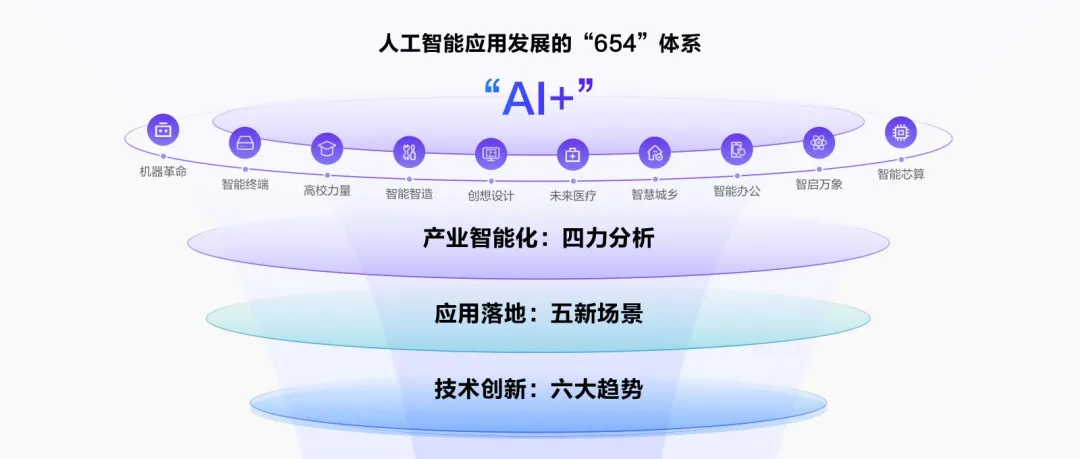 报告创新性提出 “654”体系,即六大技术创新趋势、五新应用落地场景和产业智能化四力分析模型,构建了一套既有理论深度又具实践指导价值的分析框架。这不仅是一份行业洞察,更是政策制定者、企业决策者与投资者理解 AI 产业化进程的重要参考。