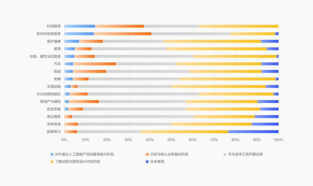 市场渗透力:数字原生、创意导向型行业成为AI应用先行者。大型企业与初创企业AI应用比例均超90%,呈U型曲线;中型企业相对滞后,30%表示缺乏AI专业人才。
