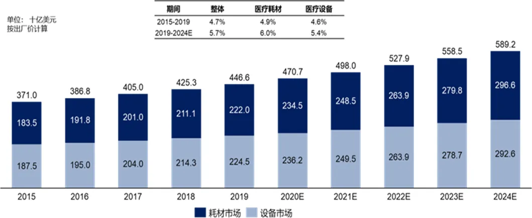 2015 年到 2019 年,全球医疗器械市场规模从 3,710亿美元增长到 4,466 亿美元。发展中国家医疗器械发展起步晚,技术水平相对落后,未满足的临床需求成为全球医疗器械市场发展的主要驱动力之一。预计2024 年,全球医疗器械市场规模将增长到 5,892 亿美元,其中医疗设备市场份额约占整体医疗器械市场的一半。