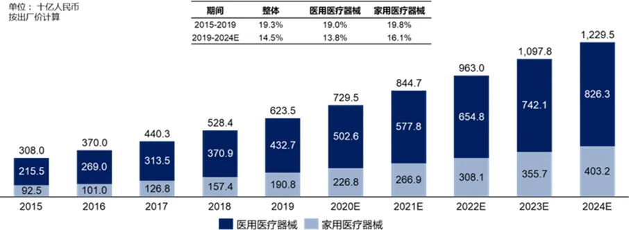 近年来,随着国内医疗需求的不断增长,我国医用医疗设备市场发展迅速。与此同时, 居民消费水平升级以及老龄化程度加深,人们对于健康管理的重视度越来越高,家庭健康管理成为市场越来越关注的领域,家用医疗设备市场也迎来了迅速发展。中国医疗器械市场规模从2015 年的3,080 亿人民币增长至2019 年的6,235 亿人民币。其中家用医疗器械在 2019 年的市场规模达到 1,908 亿人民币。随着慢性病患者人数持续增长,健康管理意识及居民可支配收入的提高,家用医疗器械市场规模预计到 2024 年将以年复合增长率 16.1%速度增长至 4,032 亿人民币。