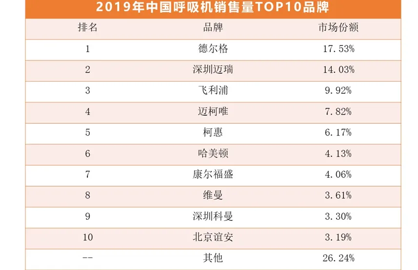 图表17: 2019年中国呼吸机销售TOP10品牌