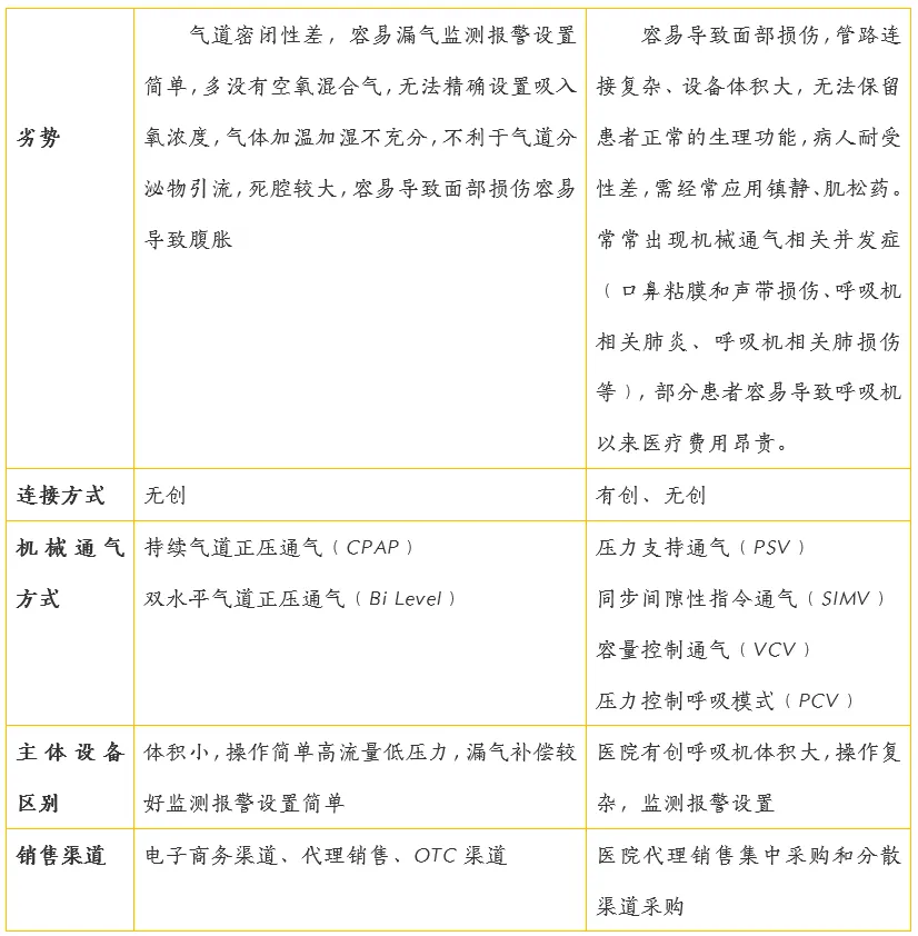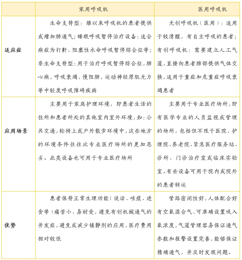呼吸器械根据不同情况由很多分类,根据这些分类其具有不同的应用场景,以下按照呼吸机的为例,按照应用场景分类,可以分为医用呼吸机和家用呼吸机。按注册分类分为二类医疗器械和三类医疗器械,其中三类医疗器械绝大多数都用于医用,而二类医疗器械在两种场景中均有体现。对于家用和医用呼吸机,他们有着不同的优势与劣势,这也是决定其应用场景的原因,同时这两种应用场景的产品销售渠道也有相应的不同。