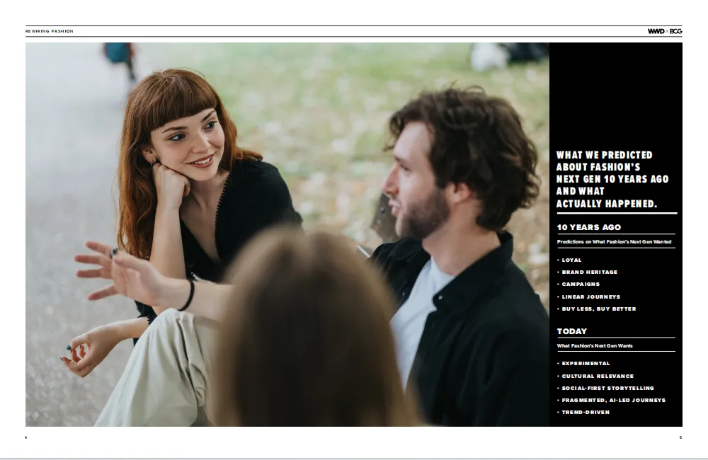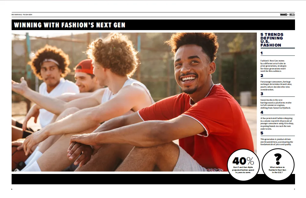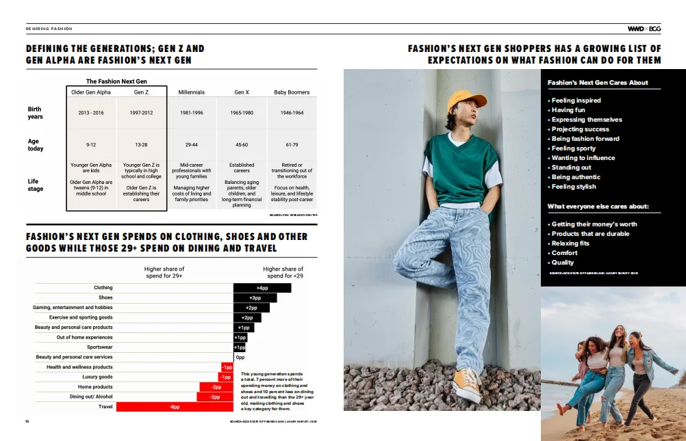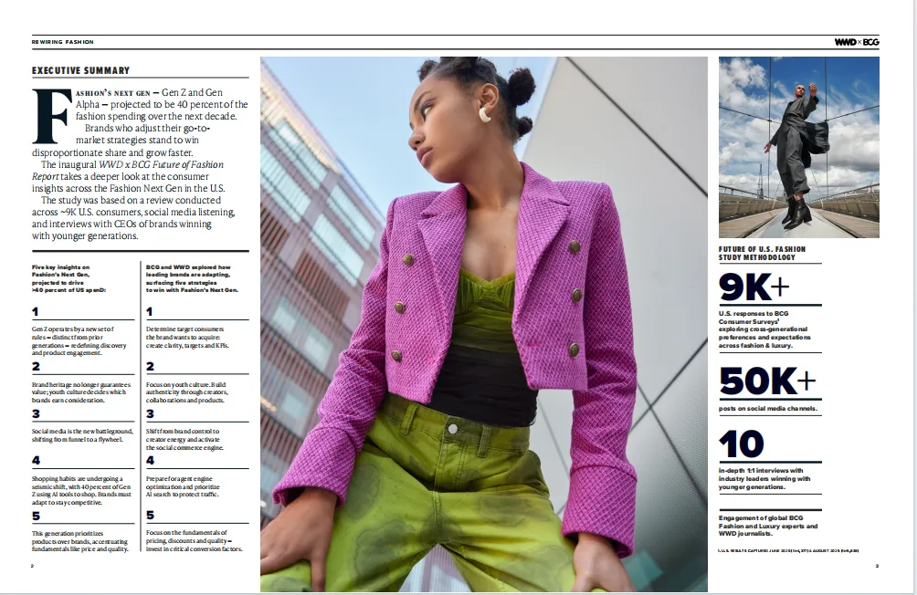 《Z 世代与 Alpha 世代如何重塑时尚产业》报告由 WWD 与 BCG 联合发布,基于对近 9000 名美国消费者的调研、5 万余条社交媒体内容分析及 10 位行业领袖访谈,深入剖析了占未来十年美国时尚消费 40% 份额的年轻世代(Z 世代:1997-2012 年出生;Alpha 世代:2013-2016 年出生)的消费特征与行业应对策略。