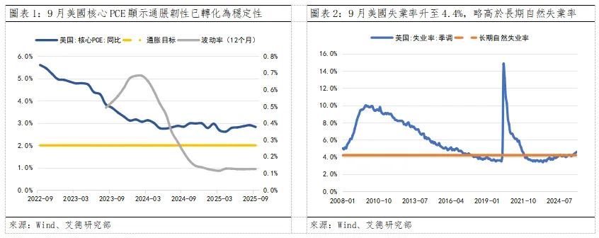 2025年以來,美國經濟呈現“通脹穩、就業弱”的非對稱格局:根據圖表1,核心PCE同比增速持續穩定在2.8%左右,而失業率從1月的4.0%升至10月的4.6%,特別是私營部門就業人數持續下滑而職位空缺人數區於低谷穩定。隨著美聯儲加息的滯後效應顯現,經濟活動放緩,企業會更謹慎,失業率回升、招聘放緩、裁員增加的現象或意味著顯示勞動力市場存在“非線性惡化”風險。美聯儲紐約聯儲行長威廉姆斯明確表示,“在通脹可控前提下,降息是防範就業市場下滑的必要舉措”,這一觀點成為政策轉向的核心共識。
