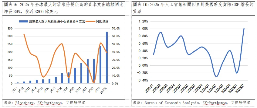 根據美國經濟分析局數據統計,2025Q2的AI相關投資占美國實際GDP的比重猛增至約1.0%。雖然2023年和2024年,AI投資因宏觀環境挑戰,如利率上升和金融環境收緊低於預期,然預計2025Q2的驟然拉高有望有所突破。總體而言,AI相關投資強勁的增長勢頭依然存在,預計2025年,人工智慧投資對美國實際GDP的貢獻有望升至6%。
