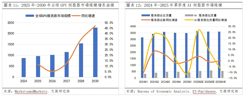 - AI基礎設施層:算力是AI發展的核心基石,當前英偉達、AMD等頭部晶片廠商訂單可見度已達18個月,產能緊張態勢持續。據MarketsandMarkets數據顯示,2025年全球伺服器GPU的市場規模有望突破1199.7億美元,預計到2023年增至2280.4億美元,年複合增長率高達13.7%。其中,AI伺服器預計2025年將占整體伺服器市場總值的72%。