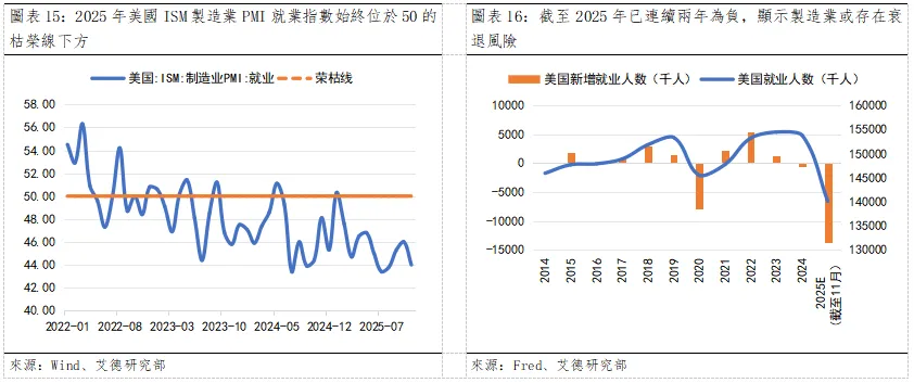 回顧2025年,美國ISM製造業PMI就業指數始終位於50的枯榮線下方,顯示美國製造業就業市場的景氣較弱。而從美國製造業就業人數年度淨增量的趨勢變化來看,截至2025年已連續兩年為負,顯示製造業或存在衰退風險。這或主要源於美國總統特朗普的關稅和貿易政策給企業帶來的不確定性。然摩根大通預計2026年上半年美國製造業就業人數可能會持續緩慢增長的狀況,然下半年有望有改善跡象。這一方面得益於關稅政策趨於穩定、《通脹削減法案》(OBBBA)中實行的減稅措施和美聯儲的降息預期。