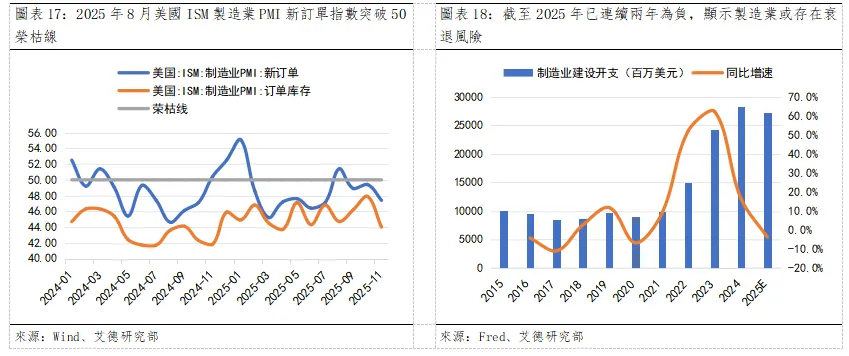 區域發展層面,密歇根州、俄亥俄州等“鐵銹地帶”已形成半導體、動力電池產業集群,成為製造業回流的核心承載區。蘋果與台積電、德州儀器等企業的合作專案落地,帶動當地上下游配套產業集聚,形成從晶片設計到製造的完整產業鏈條。2025年,相比於疲軟的製造業就業景氣水準,美國ISM製造業PMI新訂單指數卻自3月以來持續上行於8月突破榮枯線,特別是2025年初便早已突進至55水準。這意味著製造業企業的需求充裕,或傾向於新建廠房擴產,且訂單庫存指數亦同比緩慢上行,企業未來6-12個月建設支出增速或有上升的可能。同時,2024-2025年美國製造業建設開支便已持續位於高峰,或預示著製造業的廠房建設需求程度較高。