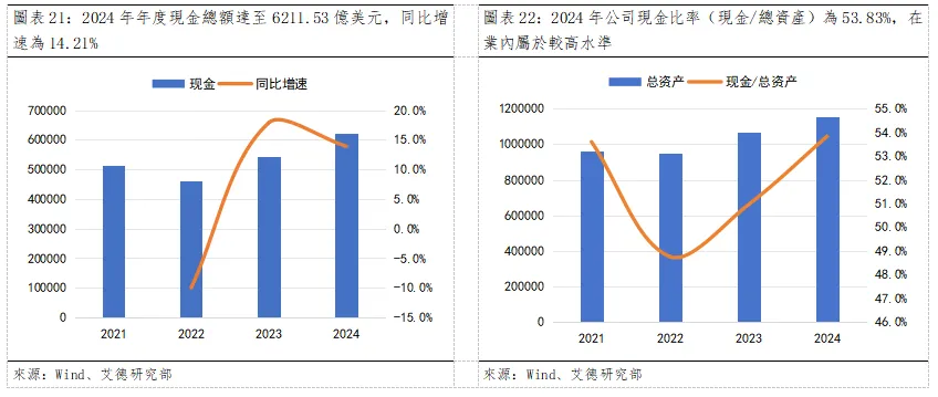 財務實力:3817 億美元現金儲備的戰略威懾力。1)現金儲備創歷史新高:自2022年起,伯克希爾公司的年度現金總額持續增長,2024年達至6211.53億美元,同比增速為13.92%。現金結構中約46.11%為短期國債,約7.68%為現金等價物。同時,2021至2024年,公司現金比率(現金/總資產)分別為53.60%、48.76%、50.96%、53.83%,在金融保險行業內屬於較高水準。