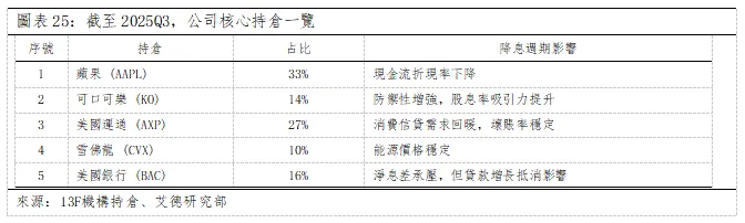 投資組合價值重估:降息週期下的估值修復。1)截至2025Q3,伯克希爾依然保持著高集中度和價值導向的股票投資組合,持有的前五家公司是蘋果 (AAPL.US)、美國運通(AXP.US)、美國銀行(BAC.US)、可口可樂(KO.US)、雪佛龍 (CVX.US)。在高波動性市場中,表明偏好具有長期競爭優勢和穩定現金流的企業。