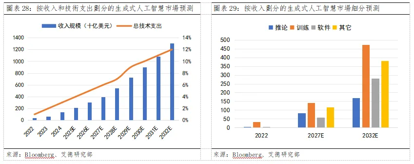 2022年,85%的收入與用於模型訓練的計算基礎設施相關,10%用於推論,3.56%用於軟體。但預計隨著商業化進程的加速,2032年AI軟體的年收入將達到2800億美元,占總收入的21.47%。