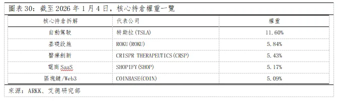 持倉結構:AI 全產業鏈的精准佈局。截至2026年1月4日,ARKK 共持有46只股票,前十大持倉占比52.64%,資產規模36.73億美元,持倉結構高度集中於 AI 核心賽道。1)核心持倉拆解(前五大):