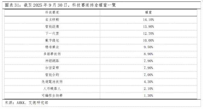 2)持倉協同效應:AI 產業鏈閉環優勢。按技術分類,從ARKK的持倉來看,截至2025年9月30日,持倉權重最高(大於或等於10.00%)的科技賽道依次為自主移動、智能設備、下一代雲、數字錢包。
