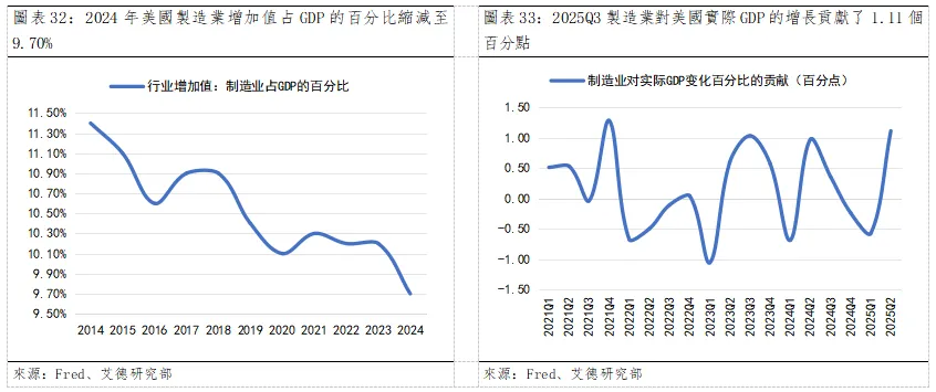 核心投資邏輯:美國製造業回流加速,三重驅動因素共振。1)政策與投資雙輪驅動,製造業增長領跑GDP。通過對2014年-2024年美國製造業增加值占GDP的百分比一路下行,截至2024年已縮減至9.70%。美國製造業占比長期下行,反映美國經濟正從“工業主導”向“服務+科技主導”轉型。而從製造業的貢獻來看,2025年第三季度製造業對美國實際GDP的增長貢獻了1.11個百分點,意味著製造業為該季度美國經濟增長提供了正向支撐。美國製造業回流或正步入加速階段。據調查,一些已經開始將生產遷回國內的公司指出,讓設計師、工程師和銷售人員在同一地點辦公,而不是遠隔重洋,或於一定程度上縮減全球零部件運輸的成本以及相關的上市時間可能會產生隱性成本,從而對利潤率和市場份額產生負面影響。