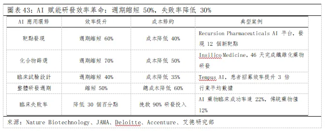 2)AI 賦能研發效率革命:週期縮短 50%,失敗率降低 30%。AI 正徹底改變藥物研發範式,從靶點發現到臨床試驗全流程賦能,創造百億級市場機遇。