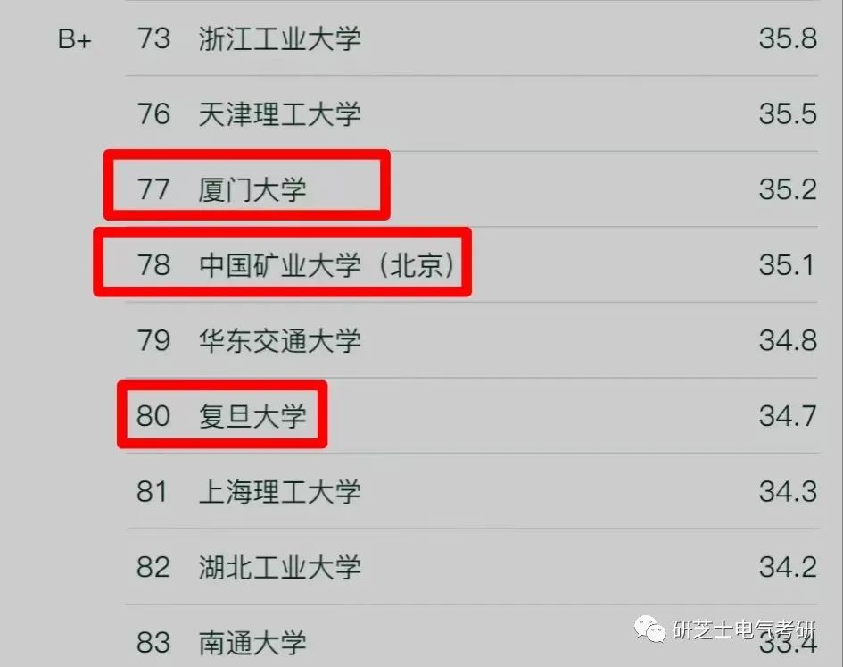 其次是选择专业评级B以上的学校,这类学校分两种,一种是学校为211/985,但电气专业在该校排名不突出的,如厦门大学、复旦大学、中国矿业大学等。