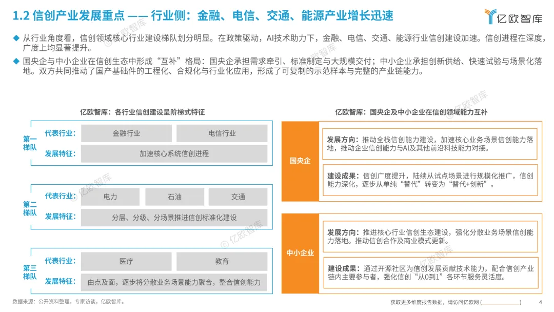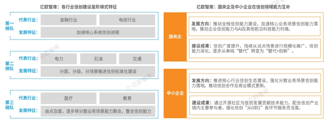 国央企与中小企业在信创生态中形成“互补”格局:国央企承担需求牵引、标准制定与大规模交付;中小企业承担创新供给、快速试验与场景化落地,双方共同推动了国产基础件的工程化、合规化与行业化应用,形成了可复制的示范样本与完整的产业链能力。