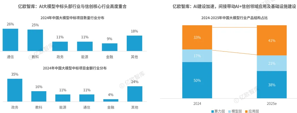 人工智能大模型加速在各类信创核心行业落地:结合行业招投标数据,政务、金融、电信、能源、教育成为大模型落地的重点领域,业务中标金额和数量均有显著提升。
