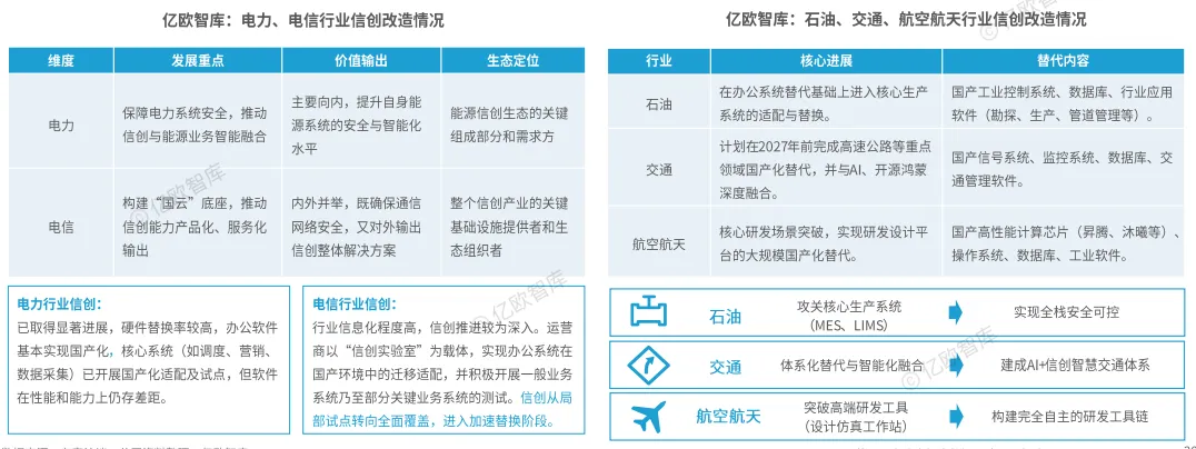 信创在电力、电信行业走向规模化;在石油、交通、航空航天行业向核心环节渗透
