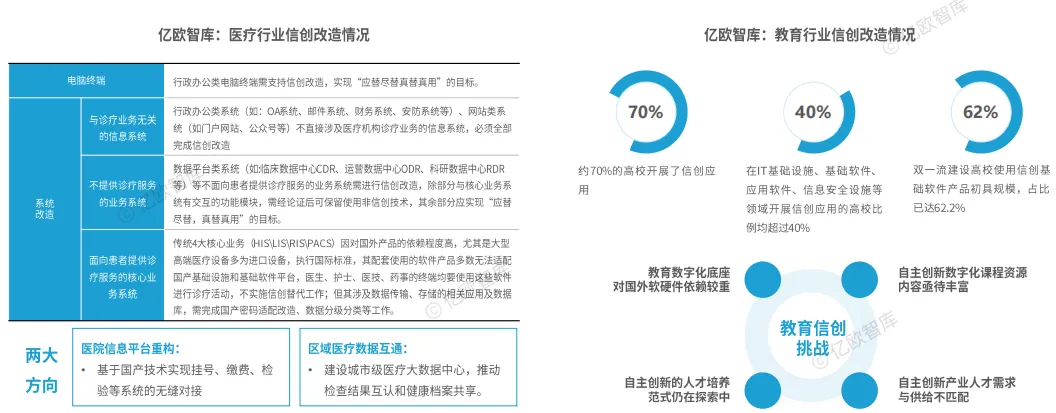 医疗和教育行业信创改造已从早期的信息化建设,升级为以数据驱动、业务协同为核心的数字化建设阶段。其中,医疗行业的信创改造正从办公系统向临床、管理等核心业务系统稳步推进,从终端硬件、基础软件等底层开始,逐步向上层应用系统延伸;教育信创改造主要服务于智慧校园、个性化教学等数字化场景,随着数字化自主创新升级工作快速开展。