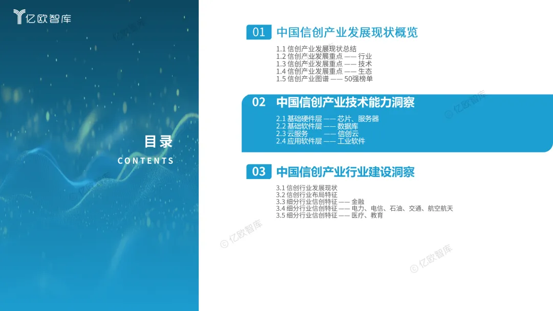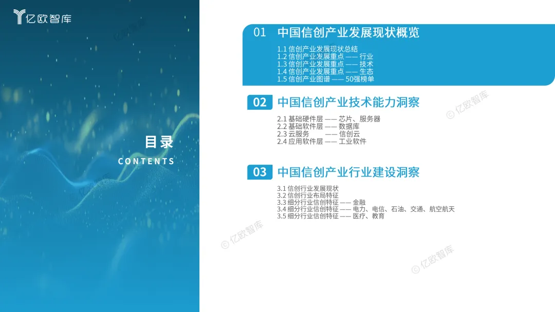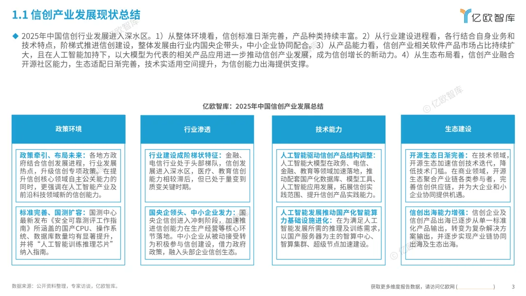 2025年中国信创行业发展进入深水区。以整体环境看,信创标准日渐完著,产品种类持续丰富;从行业建设进程看,各行结合自身业务和技术特点,阶梯式推进信创建设,整体发展由行业内国央企带头,中小企业协同配合;从产品能力看,信创产业相关软件产品市场占比持续护大,且在人工智能加持下,以大模型为代表的相关产品应用进一步推动信创产业发展,成为信创增长的新动力;从生态布局看,信创产业融合 开源社区能力,生态适配日渐完善,技术实适用空间提升,为信创能力出海提供支撑。