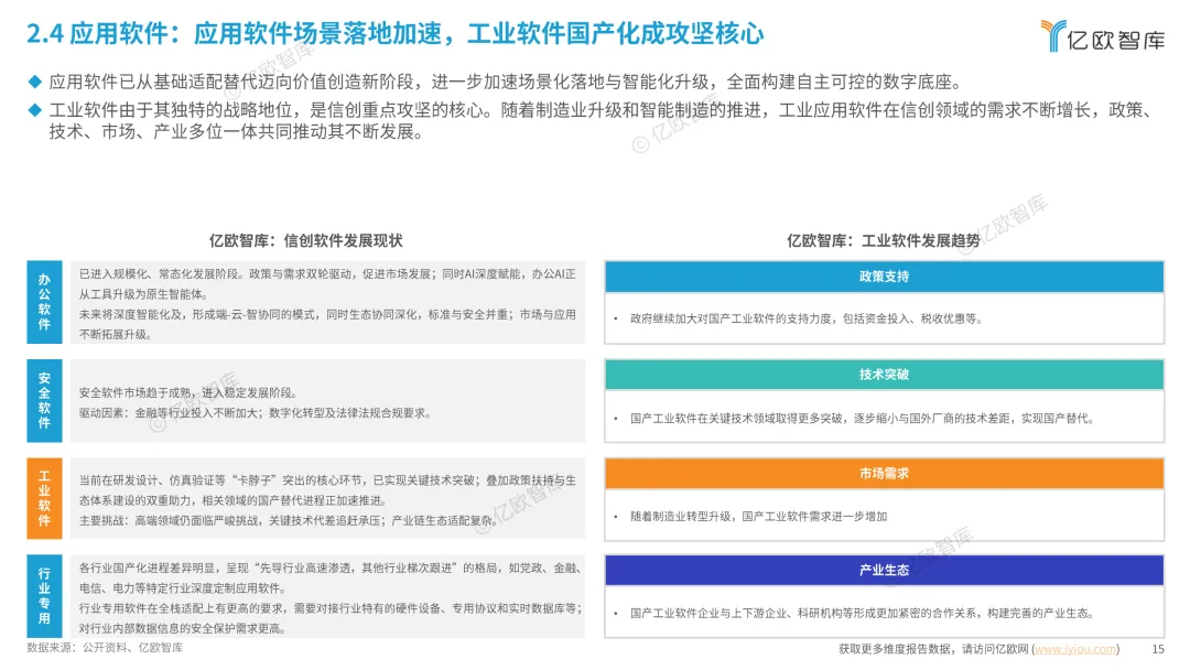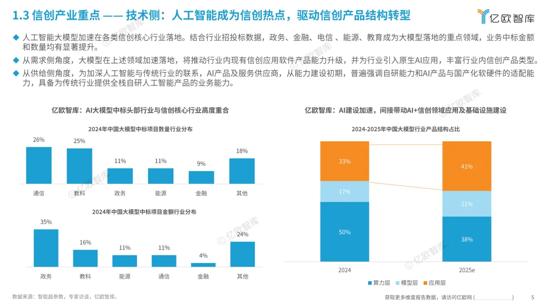 人工智能驱动信创产品结构调整:人工智能大模型在政务、电信、金融、教育等领域加速落地,推动配套国产化数据库、模型工具、人工智能应用发展,拓展信创实践范围、提升信创产品实践能力。