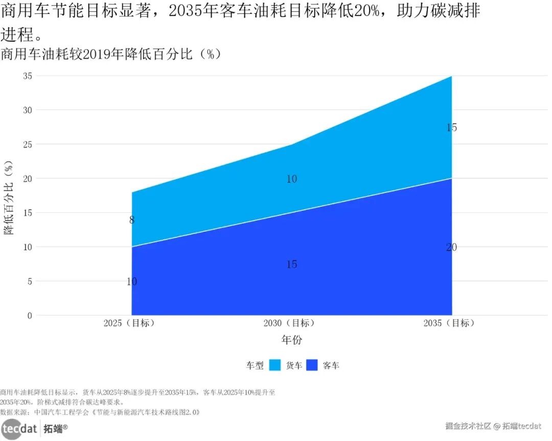 传统能源乘用车并未退出舞台,而是进入“高效节能”的最后竞争期:2016-2019年,传统能源乘用车平均油耗从6.88L/100km 降至6.46L/100km,根据《节能与新能源汽车技术路线图2.0》,2025年目标将进一步降至5.6L/100km,2035年实现4.0L/100km,较2019年降低38% 。商用车的节能空间更大——通过动力总成升级(如高效柴油机)、轻量化材料应用,货车油耗较2019年将逐步降低15% 以上,客车降低20% 以上,对于物流企业、公交公司而言,“节能车型替换”已成为降本关键。