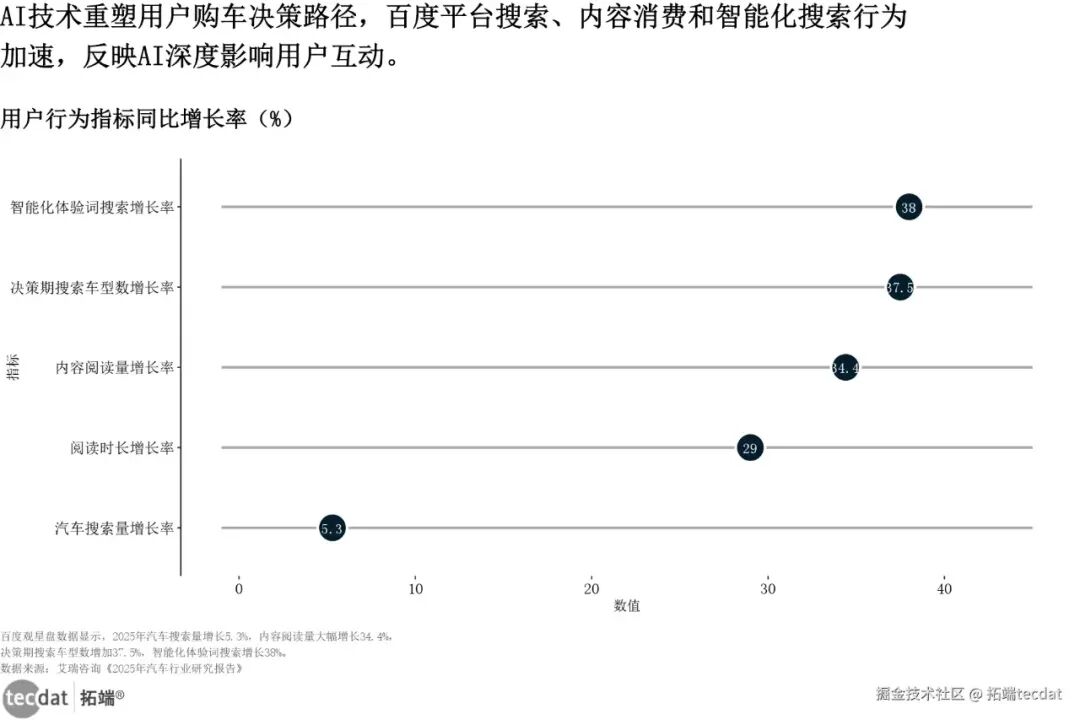 用户搜索与行为变化刻度线图表5图表数据及PDF模板已分享到会员群3秒解读:AI已渗透汽车消费、生产、营销全流程,用户搜索行为更依赖AI工具,企业端降本效果显著。对应人群行动建议:车企可在2025年内布局“AI营销矩阵”(如AI内容生成+数字人直播),重点投放百度等大流量平台;平台方可优化AI搜索算法,增加“车型对比”“购车攻略”等场景化回答;营销机构可转型“AI+汽车营销”服务,帮车企降低内容生产成本。本章节细分资源:进群可领取“新能源汽车核心技术专利报告(含电池、电驱动)”“智能网联汽车测试标准汇编(含L2-L3级)”,含50+份技术干货文档,另有AI营销工具使用教程可免费获取。