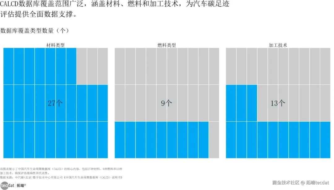 CALCD数据库覆盖范围华夫图表15图表数据及PDF模板已分享到会员群3秒解读:CALCD数据库覆盖汽车全生命周期核心数据,为低碳转型提供标准化支撑,是应对国际碳政策的关键工具。对应人群行动建议:车企可利用数据库开展核心产品(如主力新能源车型)的碳足迹核算,2025年前完成“低碳车型”认证;研发人员可基于数据优化材料选型,优先选用碳排放低的铝合金、高强度钢;政策制定者可参考数据库完善“汽车低碳标准”,推动全行业绿色转型。
