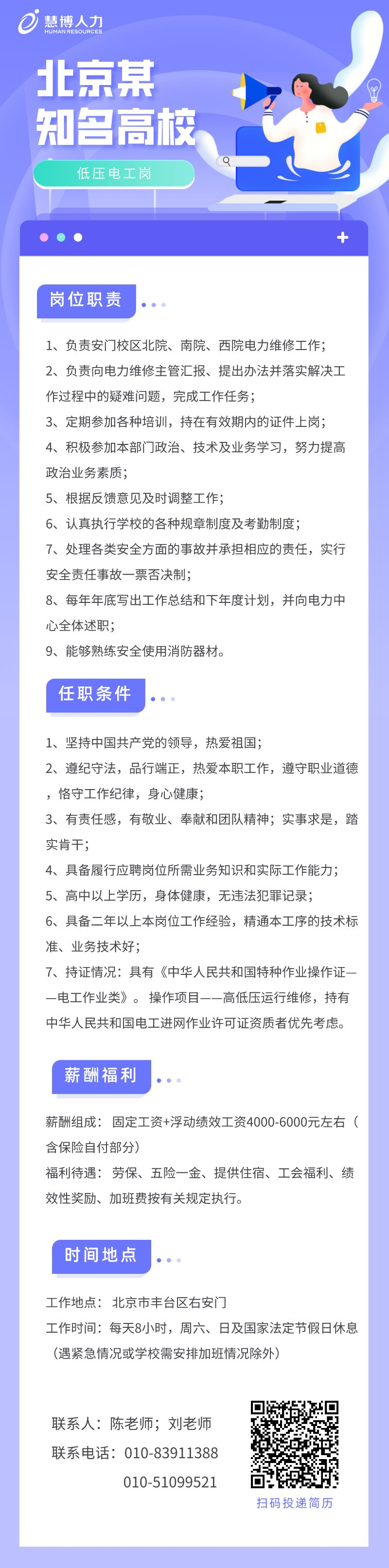 首都知名高校诚聘低压电工