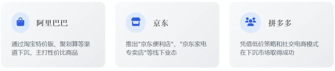 电商巨头纷纷加大下沉市场布局。阿里巴巴通过淘宝特价版、聚划算等渠道下沉;京东推出"京东便利店"、"京东家电专卖店"等线下业态;拼多多则凭借低价策略和社交电商模式在下沉市场取得成功。各电商平台的下沉策略各有侧重,但均围绕"价格优势+便捷服务+社交互动"三大要素展开。