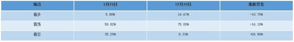 2026年1月中上旬,天然橡胶市场呈现上涨后震荡调整走势,截至1月15日收盘,RU2605合约本月最低值为15680点,最高值为16480点。金联创从行业上游生产企业、中间贸易商环节、下游制品生产企业、金融机构等各个环节市场人士代表中,对于下一周期(1月16日-1月31日)天然橡胶行业未来走势方向预期做主要调查。