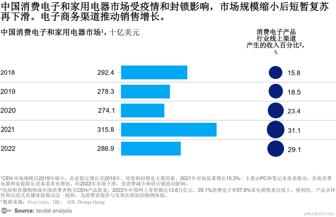 中国消费电子和家用电器市场波动,2021年增长,2022年下滑,电子商务和直播购物受欢迎。