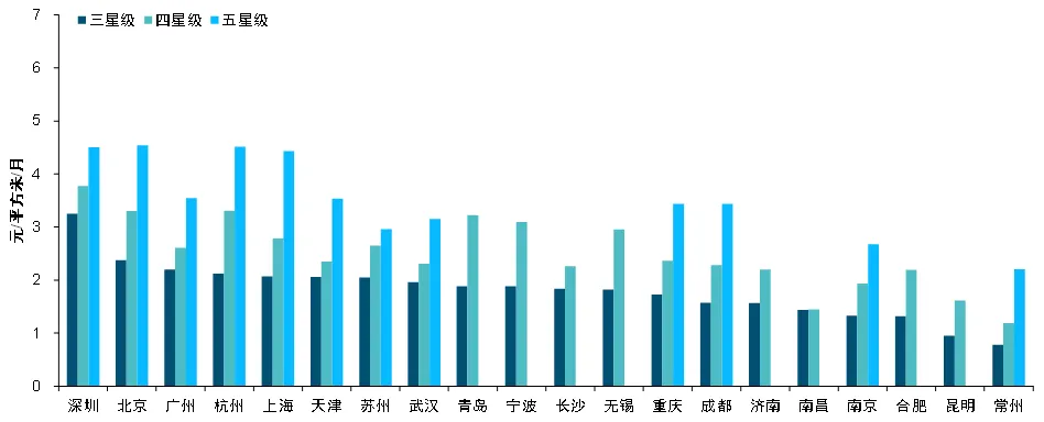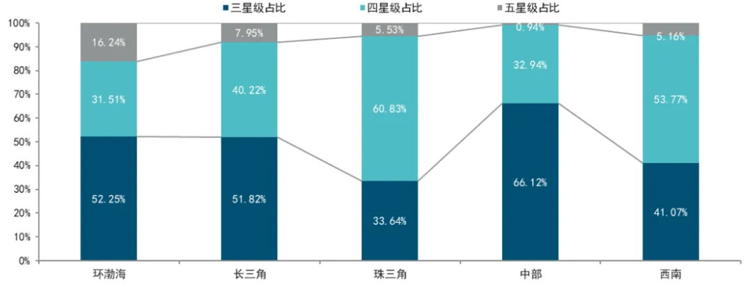 珠三角地区和西南地区四、五星级样本占比均超50%,分别为66.36%和58.93%,占比领先于长三角地区、环渤海地区和中部地区。