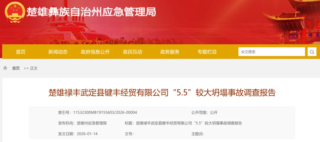 日前,云南楚雄州应急管理局公布《楚雄禄丰武定县键丰经贸有限公司“5·5”较大坍塌事故调查报告》。