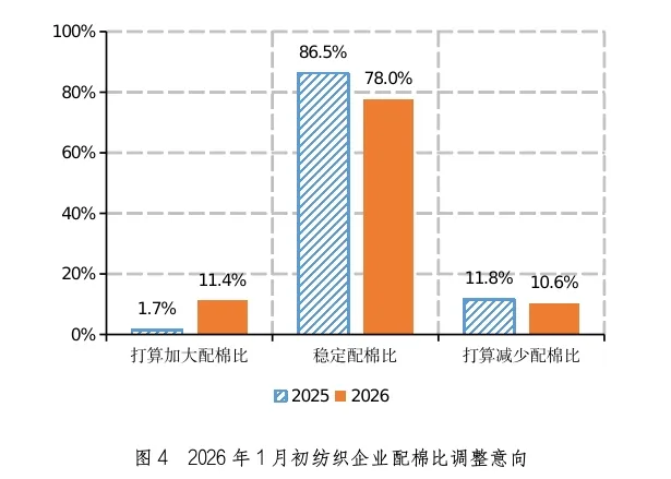 配棉意向调查显示,20261月初78%的企业打算稳定配棉比,环比减少13.6个百分点,比减少8.5个百分点,比近五年同期平均水平减少12.8个百分点;11.4%的企业打算加大配棉比,环比增加8.6个百分点,比增加9.7个百分点,比近五年同期平均水平增加8.1个百分点;10.6%的企业打算降低配棉比环比增加5.0个百分点,比减少1.2个百分点,比近五年同期平均水平增加4.7个百分点(如图4)。