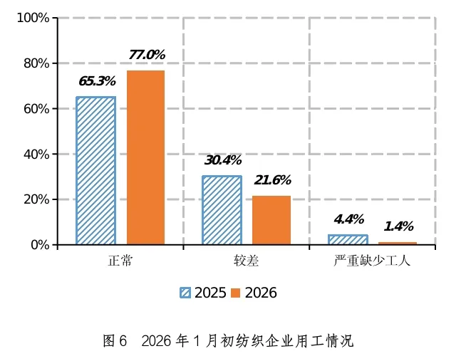 20261月初77%的企业用工情况正常,环比减少0.9个百分点,比增加11.7个百分点,比近五年同期平均水平增加17.5个百分点;21.6%的企业用工情况较差,环比减少0.5个百分点,比减少8.8个百分点,比近五年同期平均水平减少11.3个百分点;1.4%的企业严重缺少工人,环比增加1.4个百分点,比减少3.0个百分点,比近五年同期平均水平减少6.2个百分点(如图6)。