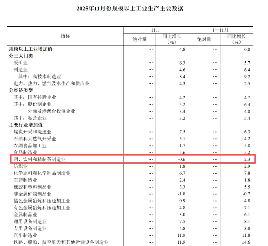 12月15日,国家统计局发布的数据显示,11月,规模以上工业增加值同比实际增长4.8%(增加值增速均为扣除价格因素的实际增长率),从环比看,11月,规模以上工业增加值比上月增长0.44%;1-11月,规模以上工业增加值同比增长6.0%。其中,11月,酒、饮料和精制茶制造业增加值同比下降0.6%;1-11月,酒、饮料和精制茶制造业增加值同比增长2.3%。