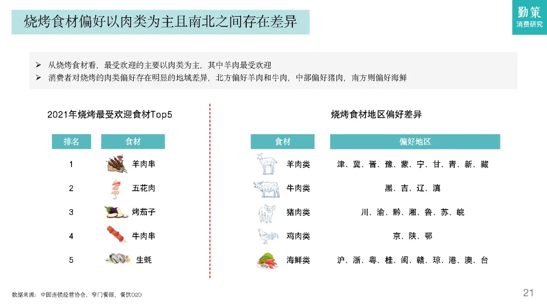 烧烤食材方面,肉类仍然是人们最喜欢的选择,尤其是羊肉备受欢迎。然而,消费者对于烧烤肉类的偏好在地域上存在明显差异。北方消费者更偏爱羊肉和牛肉,而中部地区则更青睐猪肉。南方消费者则对海鲜类的烧烤情有独钟。