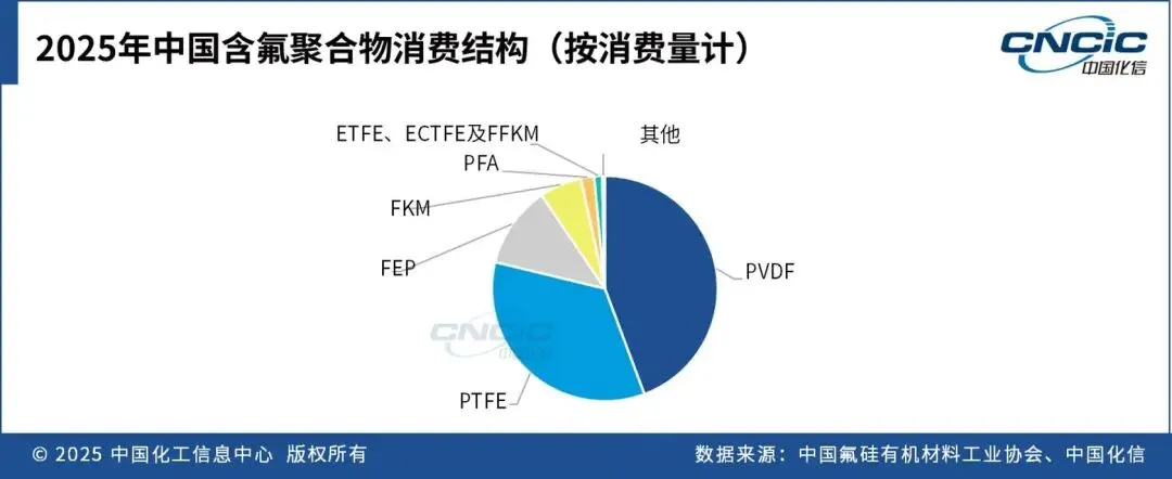 中国含氟聚合物主要包含5大产品:PTFE、PVDF、FEP、FKM和PFA。2025年,这5大含氟聚合物的市场占比达到了98.5%。其中,PVDF和PFA市场需求增长迅速,主要驱动力来自于新能源汽车、光伏和半导体领域。