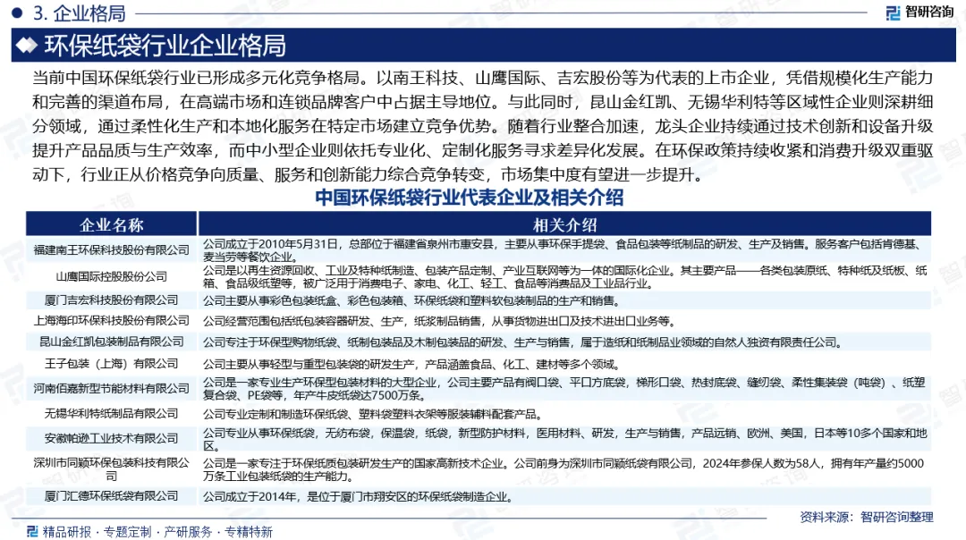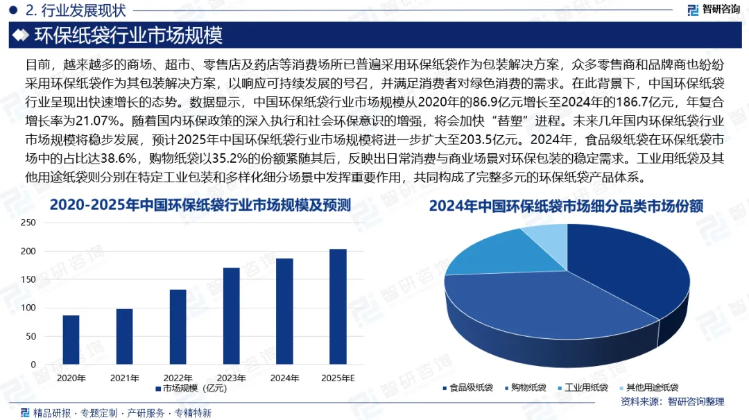 环保纸袋是以纸张为主要原料制成的容器,其制作过程仅需植物纤维提取、造纸及成型等环节,相较于化工合成的塑料袋生产过程污染更少。该制品成本低廉且易于自然降解,通过替代塑料制品可减少土壤与海洋的微塑料污染。环保纸袋按照应用领域可分为食品级纸袋、购物纸袋、工业用纸袋和其他用途纸袋。环保纸袋凭借其可降解性与环境友好性,已成为替代传统塑料包装的重要选择。它以纸浆为主要原料,加工过程中不添加有害化学物质,能够在自然环境中快速分解,有效减少对土壤和水源的长期污染。与塑料袋相比,环保纸袋在整个生命周期中的碳排放显著较低,且多数采用回收再生工艺生产,进一步降低了资源消耗。随着全球环保意识的提升和各国“限塑”政策的持续推进,环保纸袋因其绿色环保、外观精美、质感优良等特点,在现代生活中的应用日益广泛。目前,越来越多的商场、超市、零售店及药店等消费场所已普遍采用环保纸袋作为包装解决方案,众多零售商和品牌商也纷纷采用环保纸袋作为其包装解决方案,以响应可持续发展的号召,并满足消费者对绿色消费的需求。在此背景下,中国环保纸袋行业呈现出快速增长的态势。数据显示,中国环保纸袋行业市场规模从2020年的86.9亿元增长至2024年的186.7亿元,年复合增长率为21.07%。随着国内环保政策的深入执行和社会环保意识的增强,将会加快“替塑”进程。未来几年国内环保纸袋行业市场规模将稳步发展,预计2025年中国环保纸袋行业市场规模将进一步扩大至203.5亿元。从产品结构来看,环保纸袋市场涵盖食品级纸袋、购物纸袋、工业用纸袋等多个细分品类。其中,食品级纸袋因直接接触食品,对原材料安全性与生产工艺有严格要求,具备较高的技术壁垒和附加值,因此在整体市场中占据重要地位。2024年,食品级纸袋在环保纸袋市场中的占比达38.6%,购物纸袋以35.2%的份额紧随其后,反映出日常消费与商业场景对环保包装的稳定需求。工业用纸袋及其他用途纸袋则分别在特定工业包装和多样化细分场景中发挥重要作用,共同构成了完整多元的环保纸袋产品体系。当前中国环保纸袋行业已形成多元化竞争格局。以南王科技、山鹰国际、吉宏股份等为代表的上市企业,凭借规模化生产能力和完善的渠道布局,在高端市场和连锁品牌客户中占据主导地位。与此同时,昆山金红凯、无锡华利特等区域性企业则深耕细分领域,通过柔性化生产和本地化服务在特定市场建立竞争优势。随着行业整合加速,龙头企业持续通过技术创新和设备升级提升产品品质与生产效率,而中小型企业则依托专业化、定制化服务寻求差异化发展。在环保政策持续收紧和消费升级双重驱动下,行业正从价格竞争向质量、服务和创新能力综合竞争转变,市场集中度有望进一步提升。