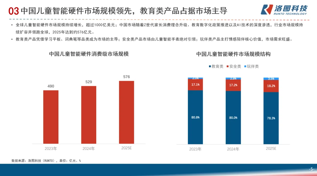 根据洛图科技(RUNTO)数据显示,随着AI技术的深度渗透、Z世代家长消费理念的升级及教育数字化政策的推进,2025年中国儿童智能硬件消费级市场规模达到了约576亿元。其中,教育类产品的销售额占据了主导地位,安全类、玩具类产品占比稳步提升。市场表现折射出了家长对儿童学习、安全、健康、陪伴等全场景成长的多元需求升级。
