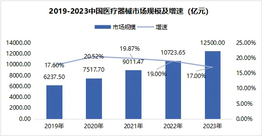 据分会不完全统计,2023年我国医疗器械工业市场规模达12500亿元人民币,同比增长17%。与全球医疗器械市场相比,中国医疗器械市场增速是全球医疗器械行业增速的2.4倍,国内医疗器械市场发展具有广阔的发展空间。
