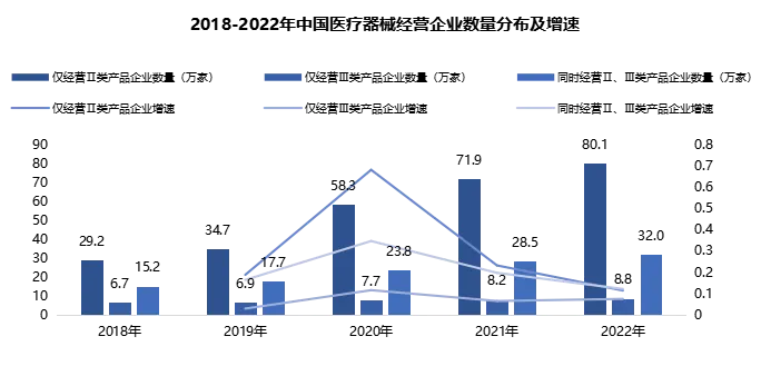 截至2022年,据国家药监局数据显示,全国II、III类医疗器械经营企业数量共120万余家,同比增长11.37%。其中,仅经营II类医疗器械产品的企业80万余家,仅经营III医疗器械产品的企业8万余家,同时经营II、III医疗器械产品的企业30余万家 。