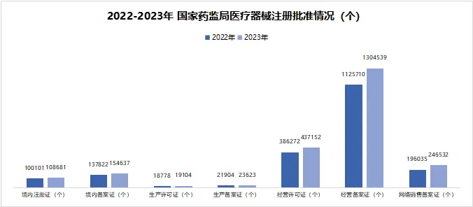 对比2022年与2023年国家药监局医疗器械注册批准情况,我国境内医疗器械产品、医疗器械生产、医疗器械经营、网络销售备案领域的许可证及备案证数量总体保持增长态势。