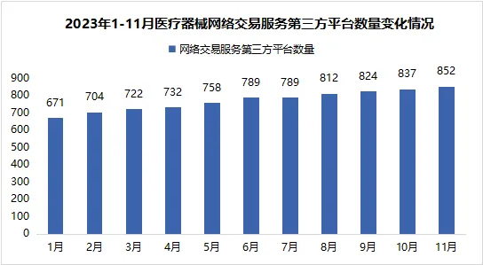据国家药监局数据显示,截至2023年11月30日,我国医疗器械网络交易服务第三方平台已达852家,相较去年整体增长30.07%。医疗器械网络销售企业规模达24.6万家。据相关数据预测显示,2023年药械网络销售规模将超过3500亿元。