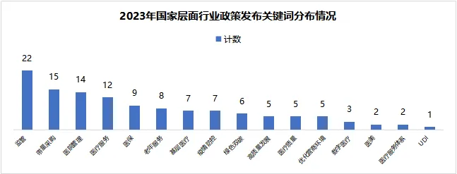 从数据分布来看,监管、带量采购、医院管理、医院服务等政策关键词占据数据分布的主流位置;医保、老年服务、基层医疗、疫情防控、绿色双碳等政策关键词占据中上游地带;高质量发展、医疗质量等政策关键词占据中下游;数字医疗、医美等则分布在尾部。数字比重并不完全代表国家对医疗板块某一领域的重点关注程度,重点政策盘点和总结详见下文。