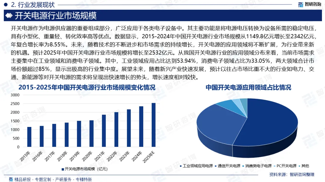 市场规模:开关电源作为电源供应器的重要组成部分,广泛应用于各类电子设备中。其主要功能是将电源电压转换为设备所需的稳定电压,具有小型化、重量轻、转化效率高等优点。随着科技的不断进步,开关电源的应用领域也在不断扩展,涵盖了工业、消费电子、医疗、汽车电子等多个行业。近年来,5G网络建设、物联网普及和数据中心扩容催生了对高性能电源的旺盛需求,特别是在服务器、边缘设备和智能终端领域,开关电源凭借其高功率密度和高转换效率成为关键支撑。与此同时,全球能源转型加速推进,光伏、风电等新能源产业快速发展,带动光伏逆变器及相关电源设备需求显著提升,同时日益严格的能效标准也推动行业技术升级。此外,消费电子市场复苏与产品创新持续拉动需求,氮化镓等新技术的应用促进电源向小型化、高效化发展,智能家居、可穿戴设备等新兴领域进一步拓展了市场空间。数据显示,2015-2024年中国开关电源行业市场规模从1149.8亿元增长至2342亿元,年复合增长率为8.55%。未来,随着技术的不断进步和市场需求的持续增长,开关电源的应用领域将不断扩展,为行业带来新的机遇。预计2025年中国开关电源行业市场规模将增长至2532亿元。